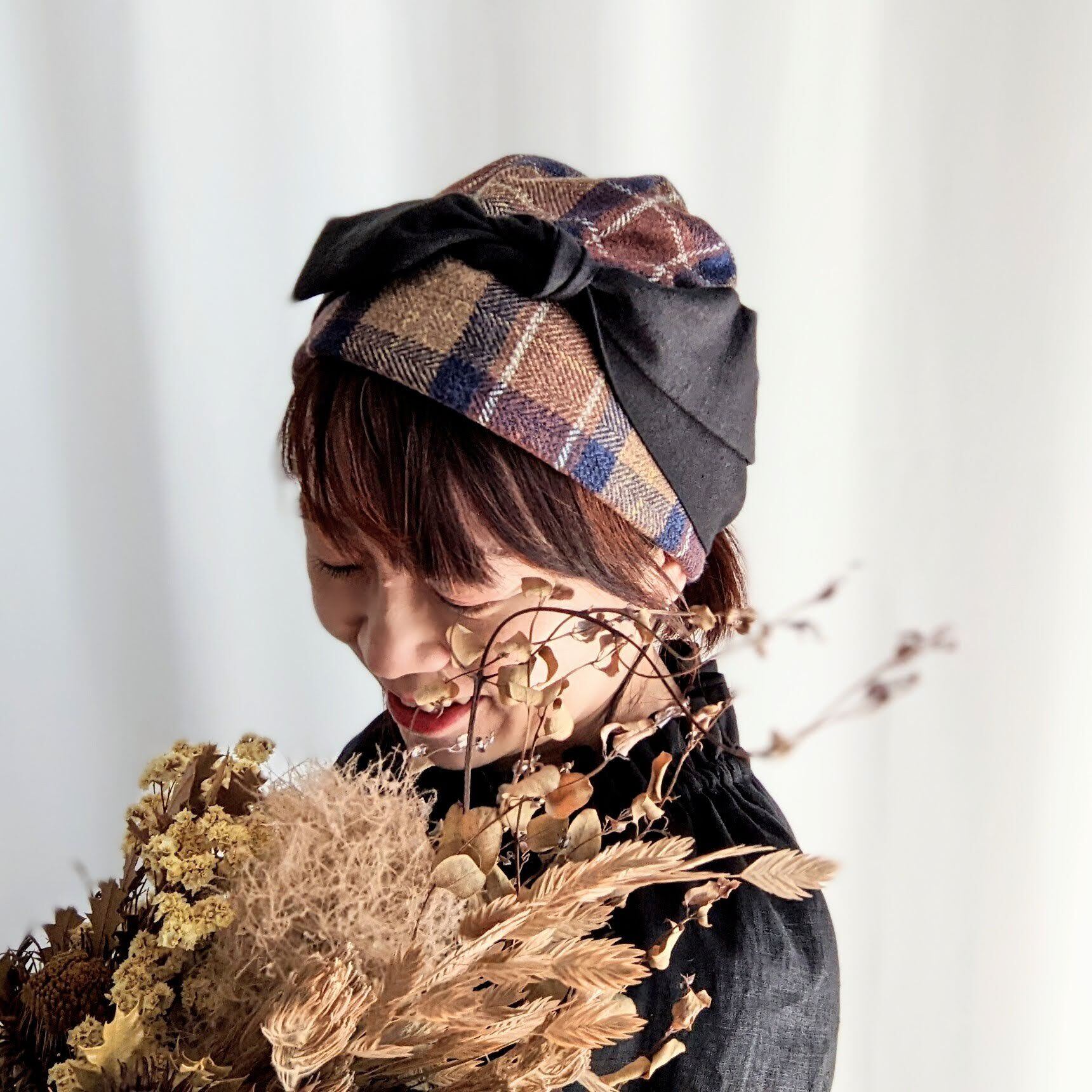 コットンツイードのあったかキャップ(ブラウンチェック×ブラック)